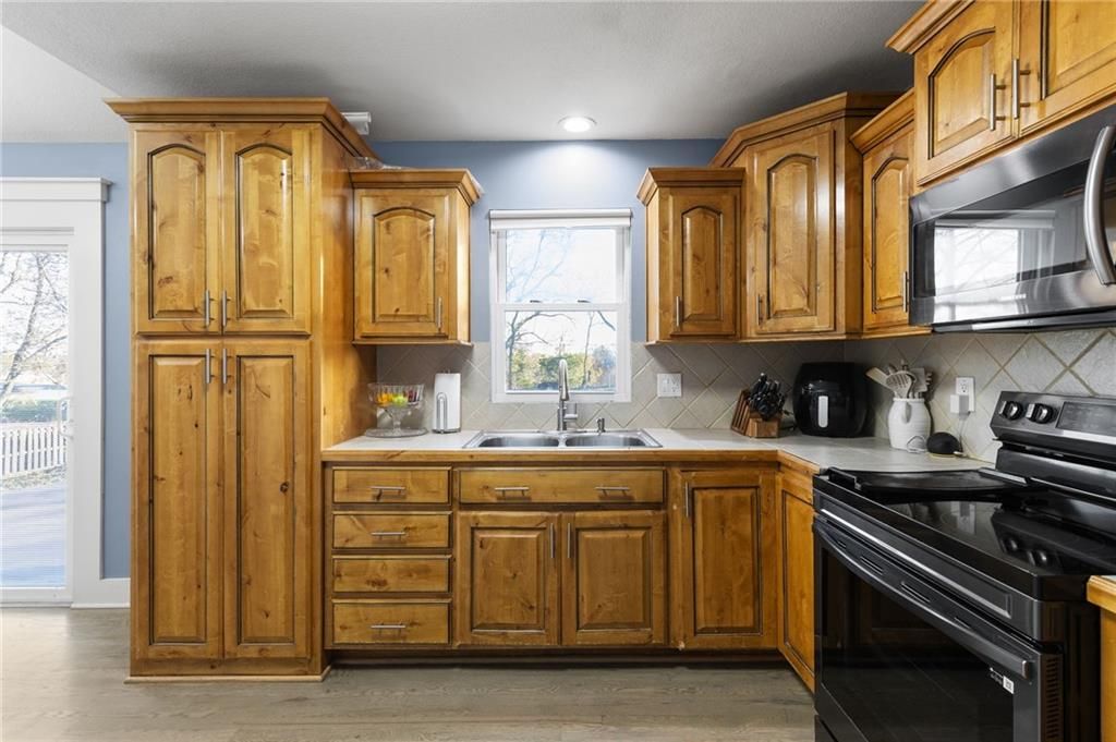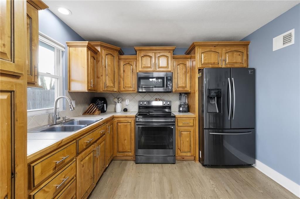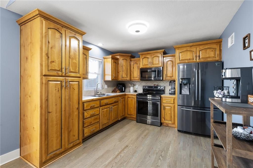 Welcome to this beautifully updated raised ranch! NEW ROOF AND GUTTERS installed last year. This home offers 3 bedrooms and 1.5 bathrooms, thoughtfully renovated throughout. Enjoy the refreshed bathrooms, and a gorgeous kitchen featuring real wood cabinets. The gleaming stained wood floors add warmth and character, while the finished basement offers a spacious recreation room that could serve as an additional bedroom or home office. The attached garage accommodates two vehicles, and the backyard is perfect for entertaining or relaxing outdoors. Conveniently located near major highways, you'll have quick access to The Legends and Missouri in just minutes. Schedule your private tour today and discover all this home has to offer!